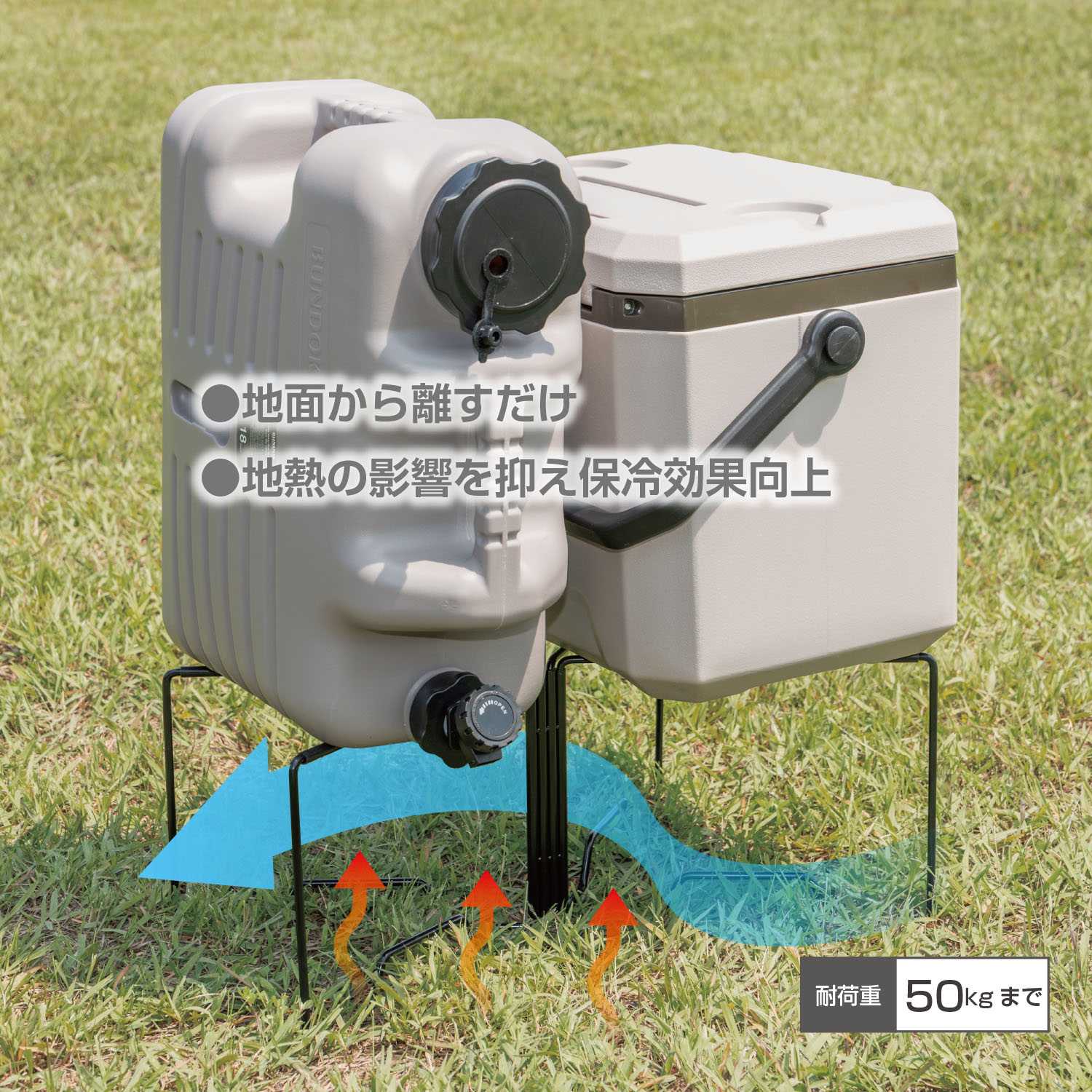 置き方で差が付く!地面から離すだけで、地熱の影響を抑え、クーラーボックス、ジャグなどの保冷効果向上、土、雑草、結露などの汚れからも解放。
