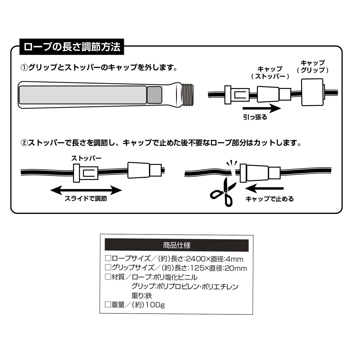 【材 質】:●ロープ/ポリ塩化ビニル ●グリップ/ポリプロピレン・ポリエチレン ●重り/スチール