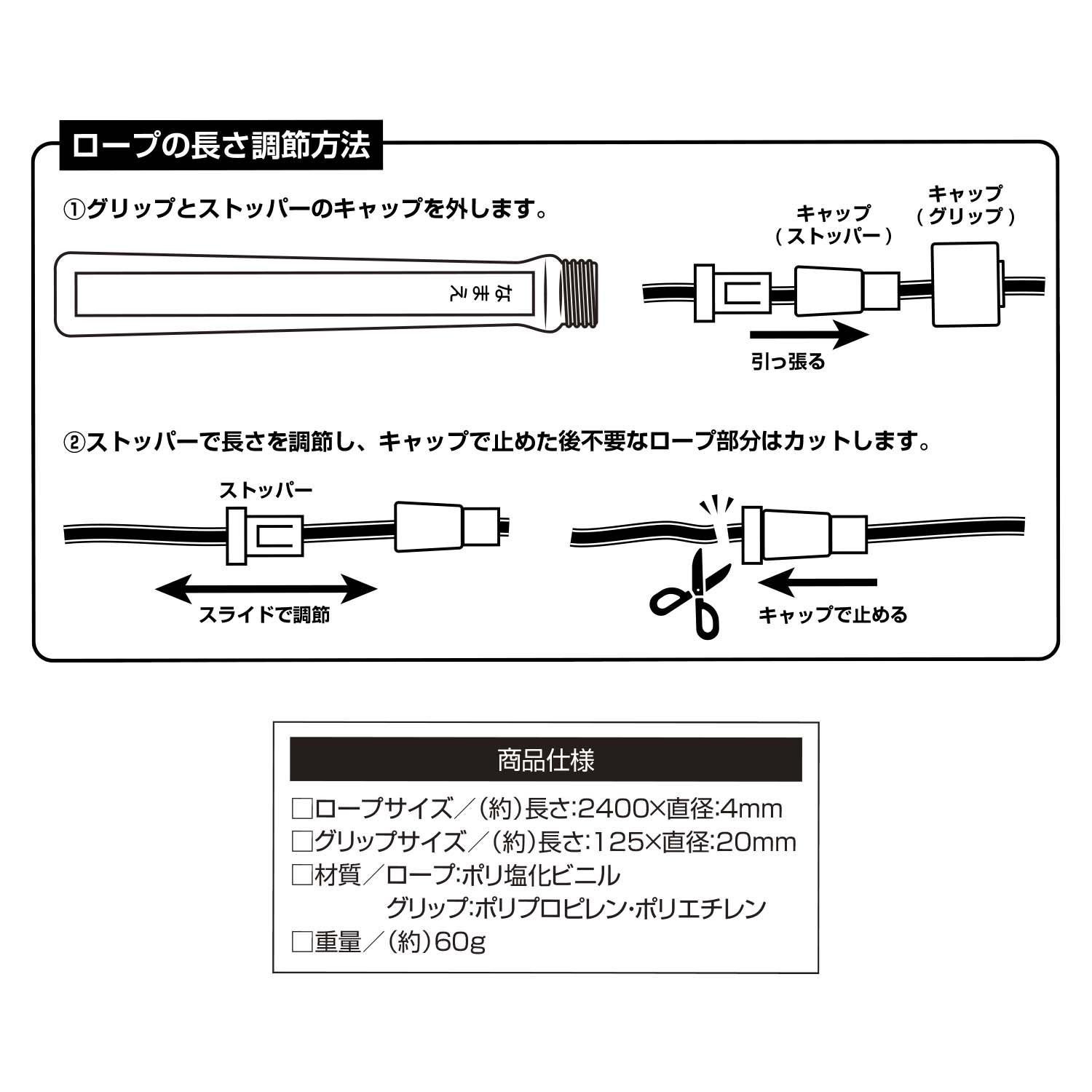 【材 質】:●ロープ/ポリ塩化ビニル ●グリップ/ポリプロピレン・ポリエチレン ●重り/スチール