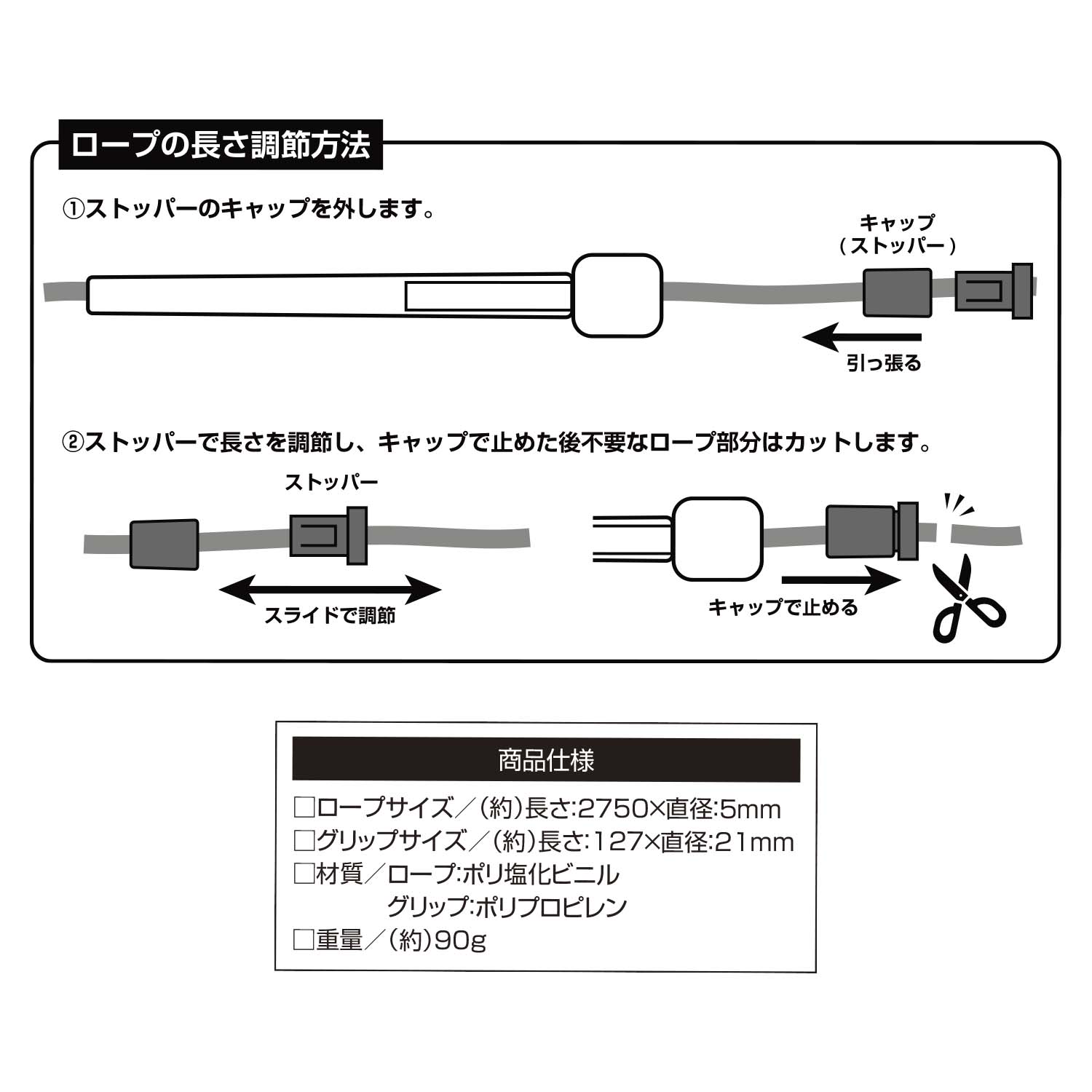 【仕 様】:●ロープ長さ/約2.75m(厚み約5.0mm) ●グリップサイズ/約127×21mm ●長さ調節可 ●対象年齢/6歳以上
